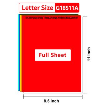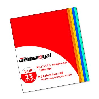 Gemsroyal Colored Full Sheet Labels Printable 8.5″×11″,5 Colors Assorted(Red,Orange,Yellow,Blue,Green),25 Sheets,Color Full Page Stickers for Laser/Inkjet Printers,Coloful Large Labels, Letter Size