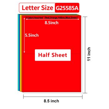 Gemsroyal Colored Half Sheet Labels Printable 5.5″×8.5″,5 Colors Assorted(Red,Orange,Yellow,Blue,Green),25 Sheets,Color Half Page Stickers for Laser/Inkjet Printers,Colorful Large Labels,Letter Size