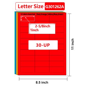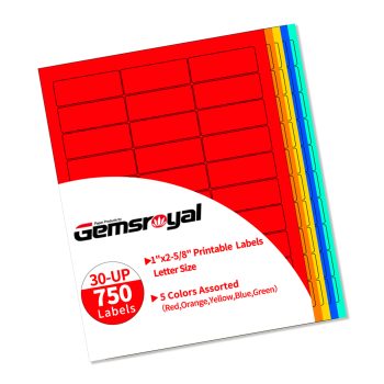 Gemsroyal Colored Address Labels Printable 1”×2-5/8″,5 Colors Assorted(Red,Orange,Yellow,Blue,Green),25 Sheets,Colorful Mailing Labels for Laser/Inkjet Printers, 30 Stickers per Sheet ,Letter Size